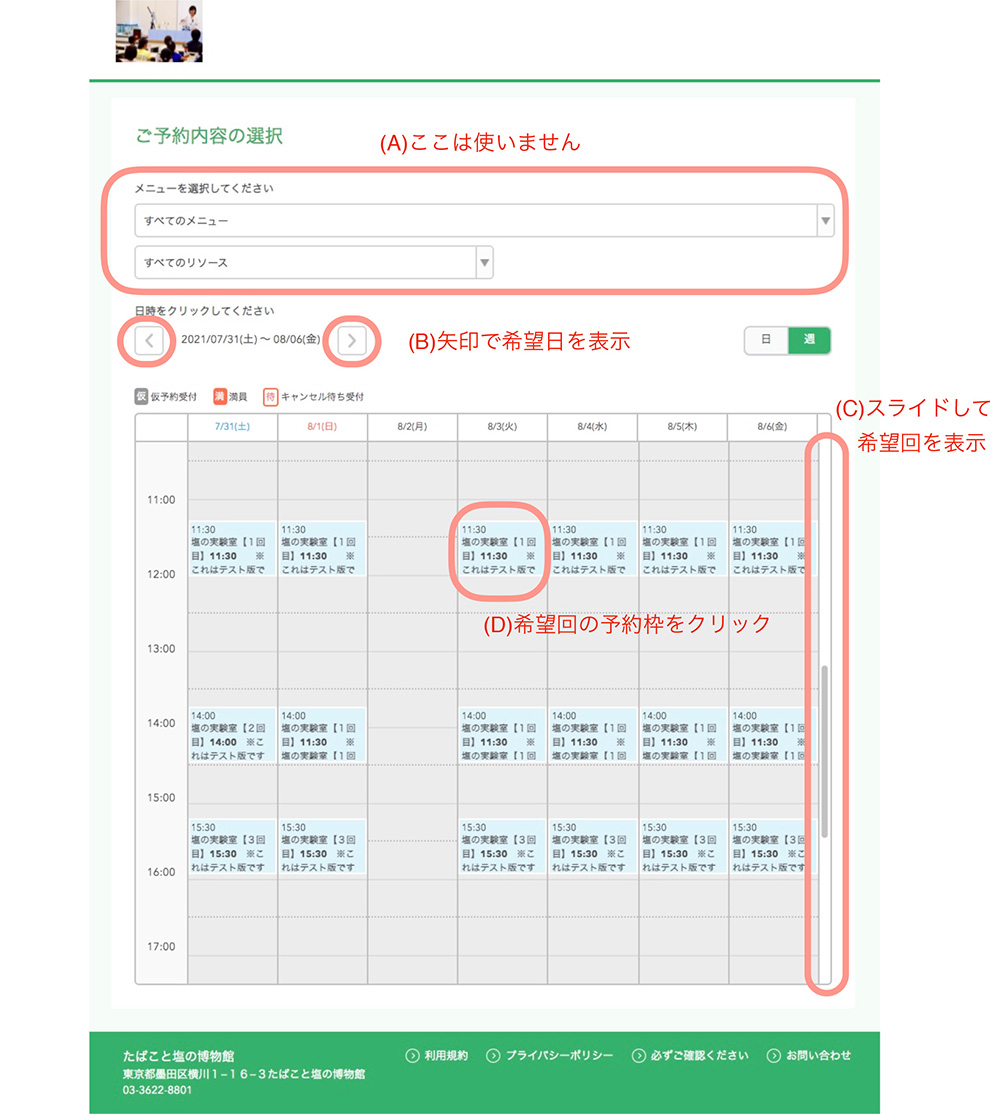 ※別の日時に予約を変えたい場合は、予約カレンダーで予約枠の操作ができる回(空席のある回)を選んで予約し直した後、すぐに古い予約をキャンセルしてください。