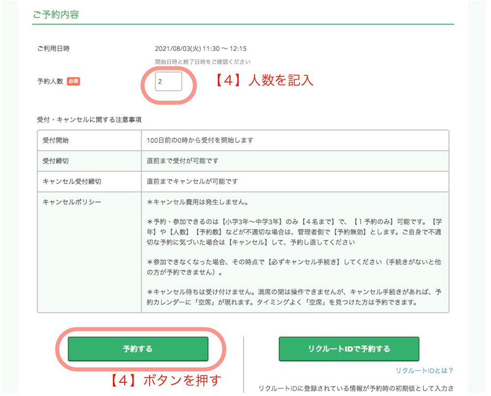 4. 予約人数を記入して「予約する」ボタンを押す