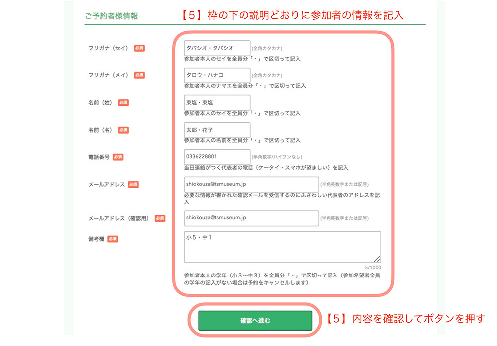 5. 記入フォームに参加者全員の情報を入力(学年の記入を忘れずに)し、「確認へ進む」ボタンを押す