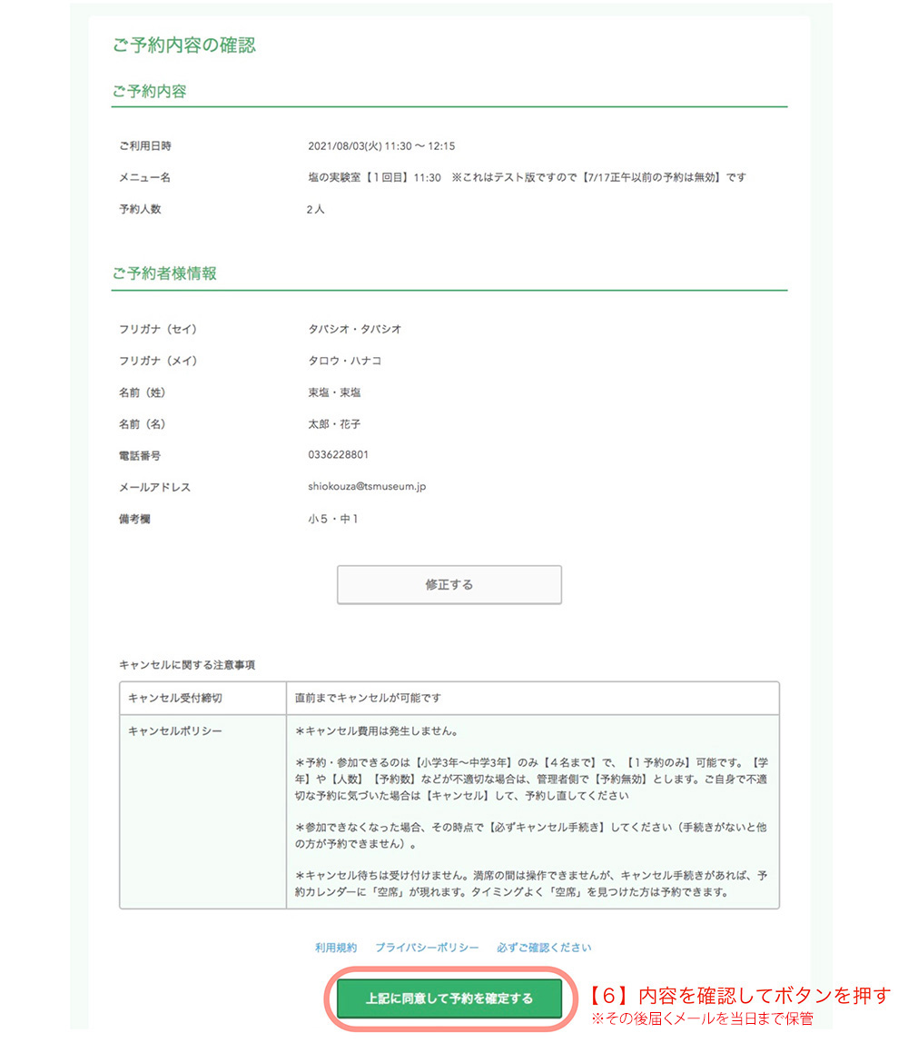 6. 予約内容を確認し「予約を確定する」ボタンを押す。その後に届くメールを確認して保管