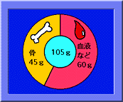 体重35kgの小学生の体の中には、血液などに60g、骨ずいの中に45g、合わせて105gの塩が溶けていて、体の調子を整えるためにはたらいとるんじゃよ。