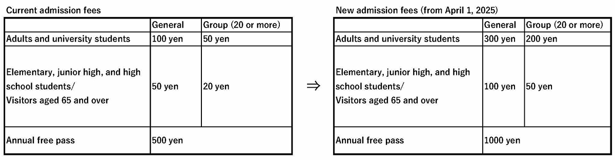In response to the recent price hikes in the procurement of materials for facilities, logistics costs and utility costs, we have decided to revise our admission fees as follows, effective April 1, 2025 (Tues).