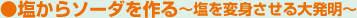 - 「ソーダ」というのは、ソーダ灰(炭酸ナトリウム)や重曹(じゅうそう)(重炭酸(じゅうたんさん)ナトリウム)などの古い呼(よ)び名だ。ガラスやせっけんには、古代から、海藻(かいそう)を焼いた灰(はい)や、特別(とくべつ)な湖でしかとれない天然(てんねん)ソーダが使われていた。天然ソーダは貴重(きちょう)だったので、ガラスやせっけんはとても値段(ねだん)が高く、だれもが使えるものではなかった。1791年に塩からソーダを作るルブラン法(ほう)が発明され、1861年にはさらに安い値段で塩からソーダを作るソルベー法が発明されたので、ソーダが大量(たいりょう)に安くできるようになった。それまで宝物(たからもの)だったガラスは日用品になり、せっけんが広まって伝染病(でんせんびょう)も減(へ)った。今、みんなが便利(べんり)にくらせるのも、塩からソーダを作る発明のおかげなのだ。