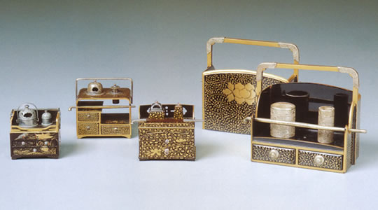 〈左から〉 芦に鶴蒔絵雛用手付きたばこ盆 4.80×4.40×3.10cm 唐草蒔絵雛用手付きたばこ盆池の端七沢屋製 5.60×5.30×3.40cm 黒塗牡丹唐草蒔絵雛用たばこ盆 5.40×5.40×3.20cm 黒塗牡丹に唐草蒔絵雛用提げたばこ盆(対) 9.20×10.00×5.60cm