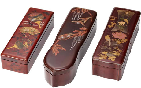 「蒔絵長手箱」3点 明治〜大正時代 左:「団扇と扇図蒔絵長手箱」 幅10.5×奥行30.5×高さ7.5cm 中:「藤に雀図蒔絵長手箱」 幅11.0×奥行39.0×高さ8.5cm 右:「花鳥図蒔絵長手箱」 幅12.0×奥行34.0×高さ8.2cm