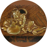 江戸後期の金工師・芹沢立民の手による、風神をかたどった前金具。このたばこ入れは、金属部分の制作をそれぞれ別の人間が担当しており、例えば根付は、立民の師である猩々天民(しょうじょうてんみん)が制作しています。一つのたばこ入れに、「たくみ」たちの師弟関係がうかがわれるのも見どころです。