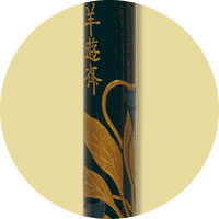 羅宇(らう)に施されたスミレの蒔絵部分に注目。この下絵を、江戸時代を代表する絵師・酒井抱一(さかいほういつ)が、蒔絵を、江戸後期に活躍した蒔絵師・原 羊遊斎(はら ようゆうさい)が担当したとされ、いわば名匠たちによる共同制作の一品。羅宇には“羊遊斎”の銘が施されています。