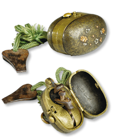 加賀(石川県)の指物師である、大野弁吉が江戸時代後期に発明したもの。側面のボタンを押すと、火打石が付いた下側の鉄が上側の鉄部分に打ち付けられて、火花が出る仕組みになっています。ふたをすると根付となり、鑑賞も楽しめる細工が施されています。