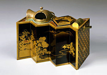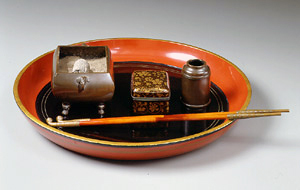 たばこ盆は、喫煙の風習が始まった頃は香道具を載せた盆(香盆)を転用したりしていましたが、のちに箱形や長角形などのバリエーションが生まれていき、火入れ・灰落し・たばこ入れの3つが揃っていることがたばこ盆の基本形となりました。また、人の意表をつくような形のものや仕掛けを施したたばこ盆のほか、格式を重んじる大名や武士の家では蒔絵が施された美術品といって良い造りのたばこ盆が制作されました。