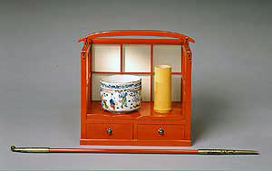 香道具を載せた盆(香盆)から派生したたばこ盆ですが、箱形や長角形など、いろいろな形をしたものが存在します。持ち運びに便利な手提げ付きや、屋外での使用も考えて三方に風覆(かぜおおい)を付けた実用性を踏まえたものから、ひねりを効かせた形状のもの、豪華な装飾が施されたものまで、実にさまざまな作品を見ることができます。