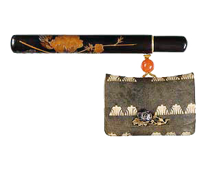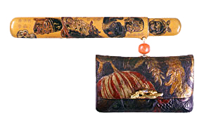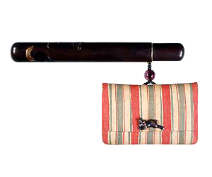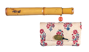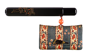 たばこ入れついては、江戸時代初期の絵画資料などから推察すると、はじめの頃は、以前からあった巾着・火打袋などの袋物を転用したようで、きせるに巾着を結び付けて持ち歩いている図などが見られます。その後、17世紀の終わり頃には紙製のたばこ入れが一般に広く普及し、やがて革や布などが素材として用いられ、人々の好みに合わせた装飾性を加えたものが作られていきました。