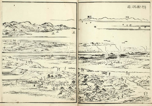 右奥に塩浜や塩を作る釜屋と煙が見える。塩は軍事物資としても重要なため、徳川幕府は行徳一体の塩業を保護し、江戸城まで塩を運ぶ水路を整備した。