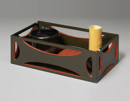 たばこ盆は、刻みたばこを入れる「たばこ入れ(たばこ壺・たばこ箱とも)」、火を保つ「火入れ」、灰皿となる「灰落し」をまとめたものです。調度品としての役割も担っていたたばこ盆には、漆塗りや蒔絵で美しく飾られたものも多くあります。