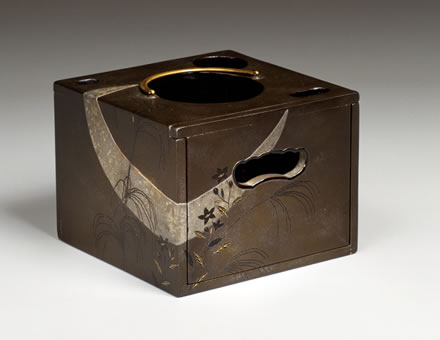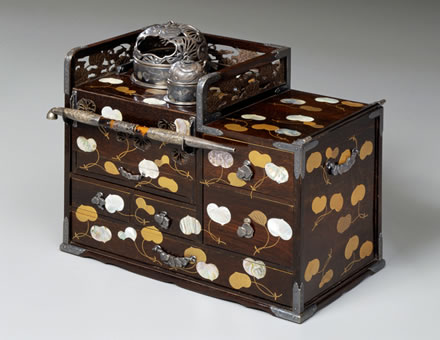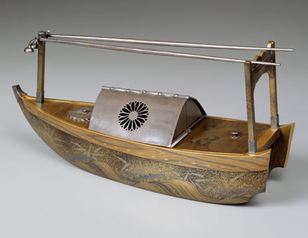 毛利家伝来とされるたばこ盆。渦巻く波の様子から船の木目までが、伝統的な蒔絵技法の数々で表現されている。中央の火屋や、きせるを受ける柱などの造形も美しい一品。