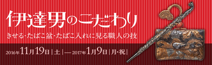 本展では伊達政宗愛用のきせるから始まり、喫煙具を制作した職人や、持ち物としての喫煙具にこだわった歌舞伎役者や噺家など、「伊達男」たちのエピソードを交えながら、きせる、たばこ盆、たばこ入れを中心に、刀装具なども合わせて150点以上の資料を展示。細部にまでこだわりを見せつつ、実用も兼ね備えた「用」と「美」の世界をご覧いただきます。