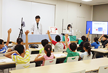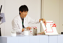 「海水から塩を作るには?」「塩水は電気を通す?」「真水と塩水の二段重ね」「塩水でせっけんを固める」など、塩の性質を知ることができる実験を、インストラクターが会場の子どもたちと対話しながら、分かりやすく実演していきます。なかでも「塩水でせっけんを固める」実験では、会場での抽選で子どもたちにも参加してもらい、その結果を確認。みんな、塩の不思議な性質に興味津々の様子でした。