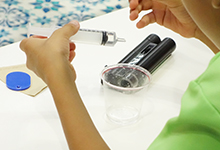 自分で塩の簡単な実験ができるコーナーです。「備長炭電池づくり」では、備長炭に食塩水を染みこませたキッチンペーパーとアルミホイルを巻くとできる電池を工作。実際にモーターが回るかなどを実験します。また、「塩の結晶づくり」では、ライトスコープ(顕微鏡)で、塩の結晶の「形」「色」「大きさ」のひみつを観察。さらに、塩水にふしぎな液体をまぜる方法を使って、その場で自分で結晶を作って観察します。ちょっとコツのいる作業もありますが、インストラクターが個別にアドバイスして、参加した全員が完成させることができました。