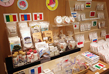 会場には世界の5つの地域(ヨーロッパ、アフリカ、アジア、日本、アメリカ)のコーナーがあり、それぞれの塩についての5種類(つくる、味つけ、保つ、運ぶ・売る、その他)の話を紹介。写真パネルのほかにも、めずらしい外国の塩・コショウ入れや、昔の塩俵(しおだわら)などを展示しています。
