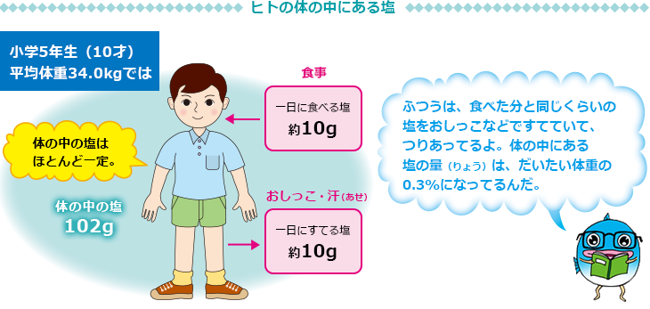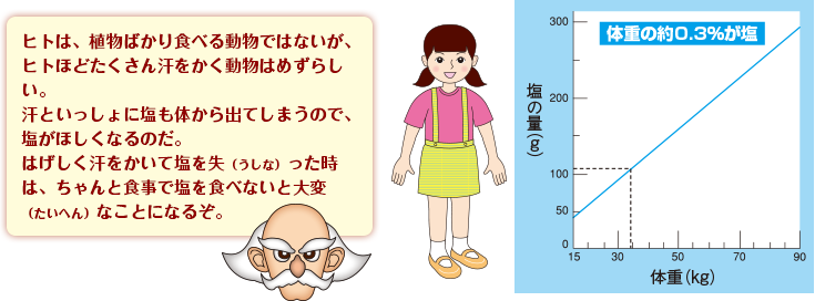 体液の塩は、ほかにも、神経(しんけい)や筋肉(きんにく)、消化液など、生きるために必要なさまざまなはたらきをささえています。