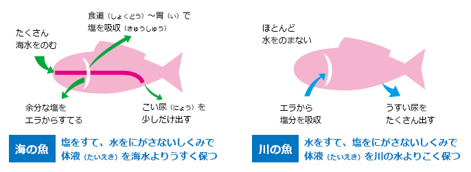 海の魚と川の魚では、体のなかの水と塩のバランスをとるしくみがちがいます(魚の体液の塩のこさは、どちらも1%前後です)。