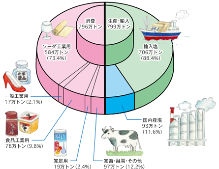 日本で使われる塩は1年間に約(やく)800万トン。そのうち調味料(ちょうみりょう)として家庭で使われる塩の量(りょう)は、3%にもなりません。食品工業用と合わせても、食べ物に使う量は全体の12%くらいです。塩のほとんどはソーダ工業などの工業に使われ、いろいろな工業製品(こうぎょうせいひん)などに姿(すがた)をかえて、私たちの生活を支(ささ)えています。実は食べ物以外(いがい)に使う量の方がずっと多いのです。日本で1年に使われる塩のうち、国内で作られているのは、12%くらいしかありません。