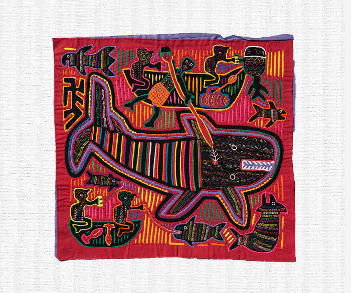 クナ族はカリブ海の中の、豊富な種類の魚が生息する小さな島々や海岸沿いに居住しています。“クナヤラ”と呼ばれるこのような地域で暮らすクナの人々は、沖までカヌーで出て、釣り糸と釣り針だけで釣る漁法を今も続けています。多種多様な魚はモラのデザインにも見ることができ、中には漁のようすを描いたものもあります。