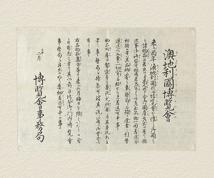 1871(明治4)年、日本政府はウィーン万国博覧会への参加を決定し、翌年から博覧会の告知、全国の物産調査、出品物の収集などを行っていきました。