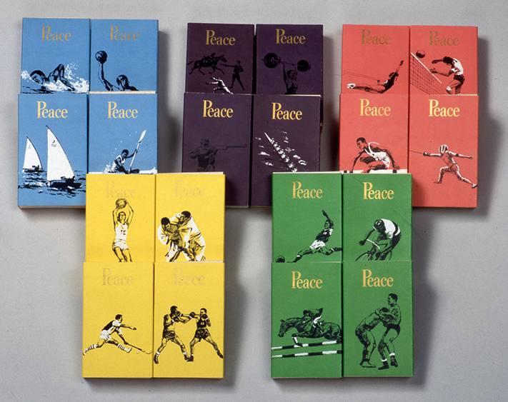 五輪カラーに合わせた5色で、全競技20種目をデザインした「ピース」をセットにして発売された記念たばこ。 -