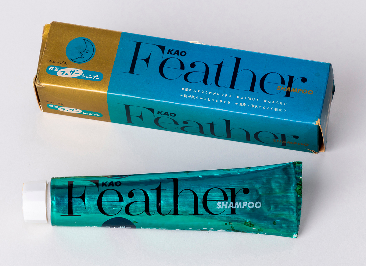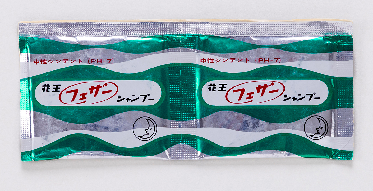 昭和初期、日本にも「シャンプー」という言葉が定着しましたが、当時の洗髪頻度は週に1回程度で、短髪の男性や子どもは、体と髪を一つの石鹸で洗うのが一般的でした。昭和30年代に入って、女性のヘアスタイルが多様化し、パーマやショートヘアが流行しますが、戦前から作られてきたシャンプーはアルカリ性の石鹸質固形シャンプーだったため、きしみやごわつきが生じて髪が痛んだり、パーマがかかりにくいモノでした。これを解決したのが昭和30年(1955)に花王石鹸が発売した中性の合成洗剤による粉末シャンプー「花王フェザーシャンプー」でした。