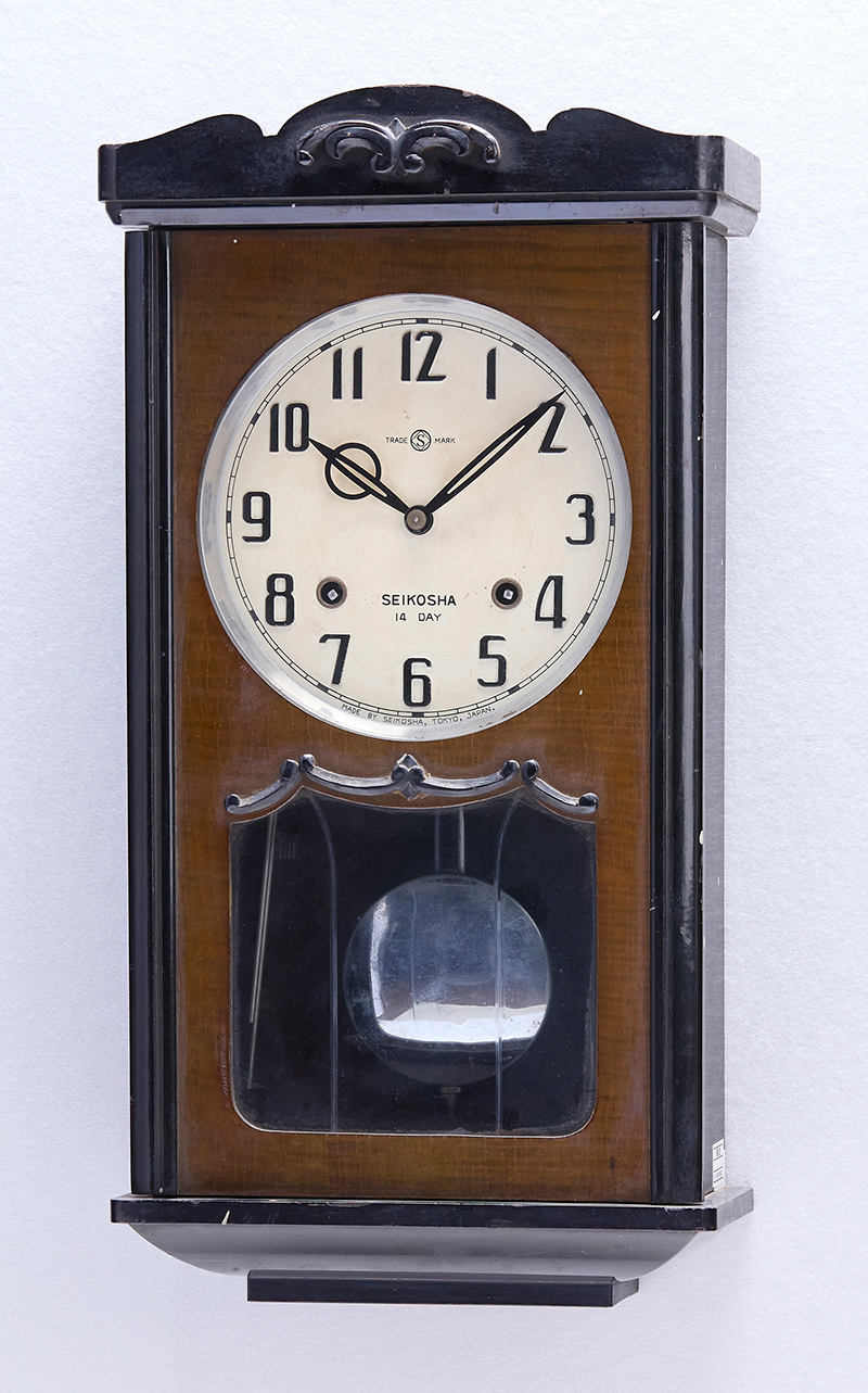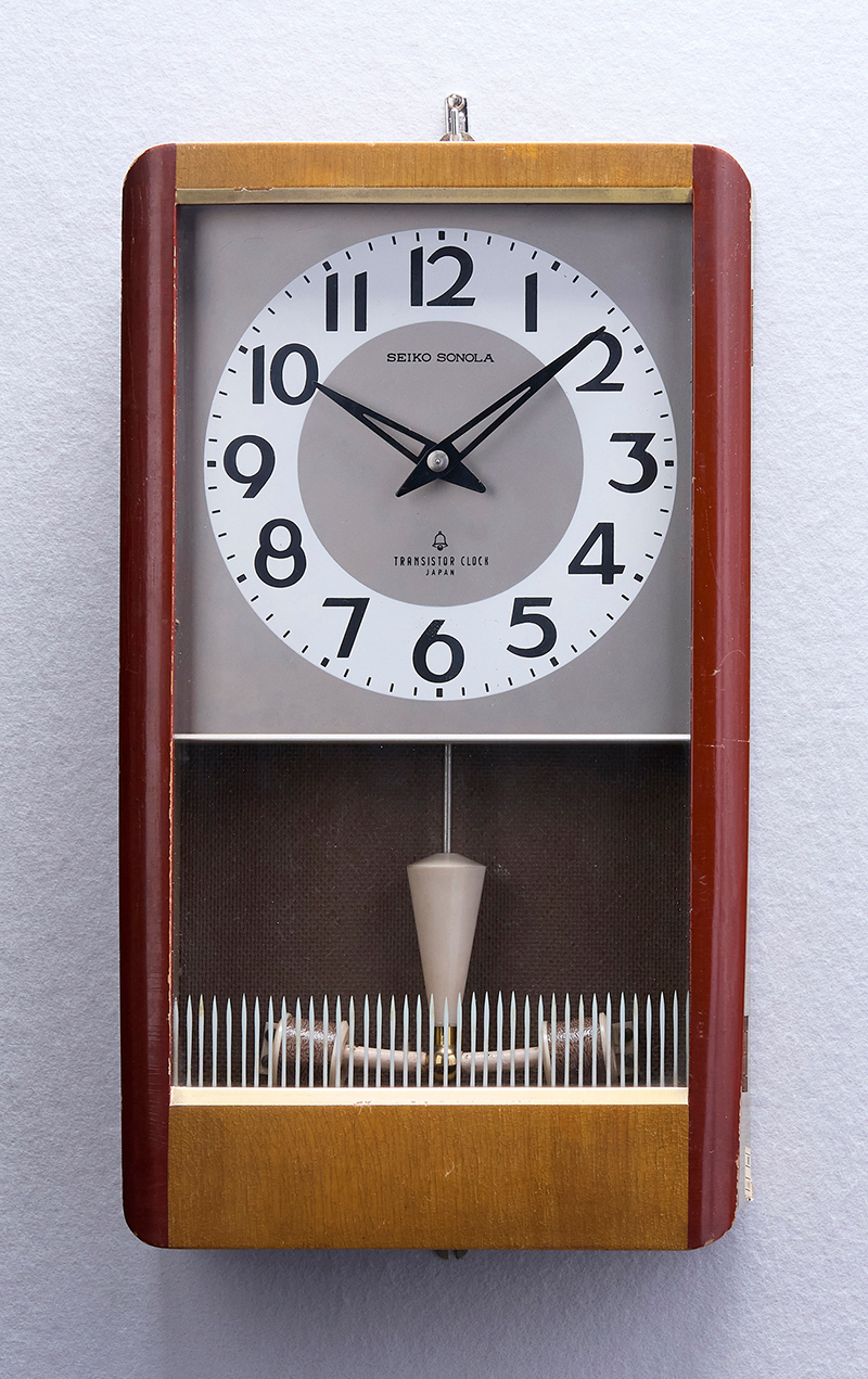 昭和30年代までの掛時計は、ぜんまい式の振り子時計、いわゆる「ボンボン時計」が一般的でした。ぜんまいを巻き上げることで動力を得て、振り子の動きで時間を計測する時計です。昭和20年代から40年代にかけてぜんまいの巻き日数を延ばしながら時間精度を高めていきました。それと並行して電池時計の研究・開発も進められていました。昭和33年(1958)には振り子の動きを電気的に制御することで正確な時間を刻む電池式トランジスタ振り子掛時計が登場。煩わしいぜんまいの巻き作業から解放されました。