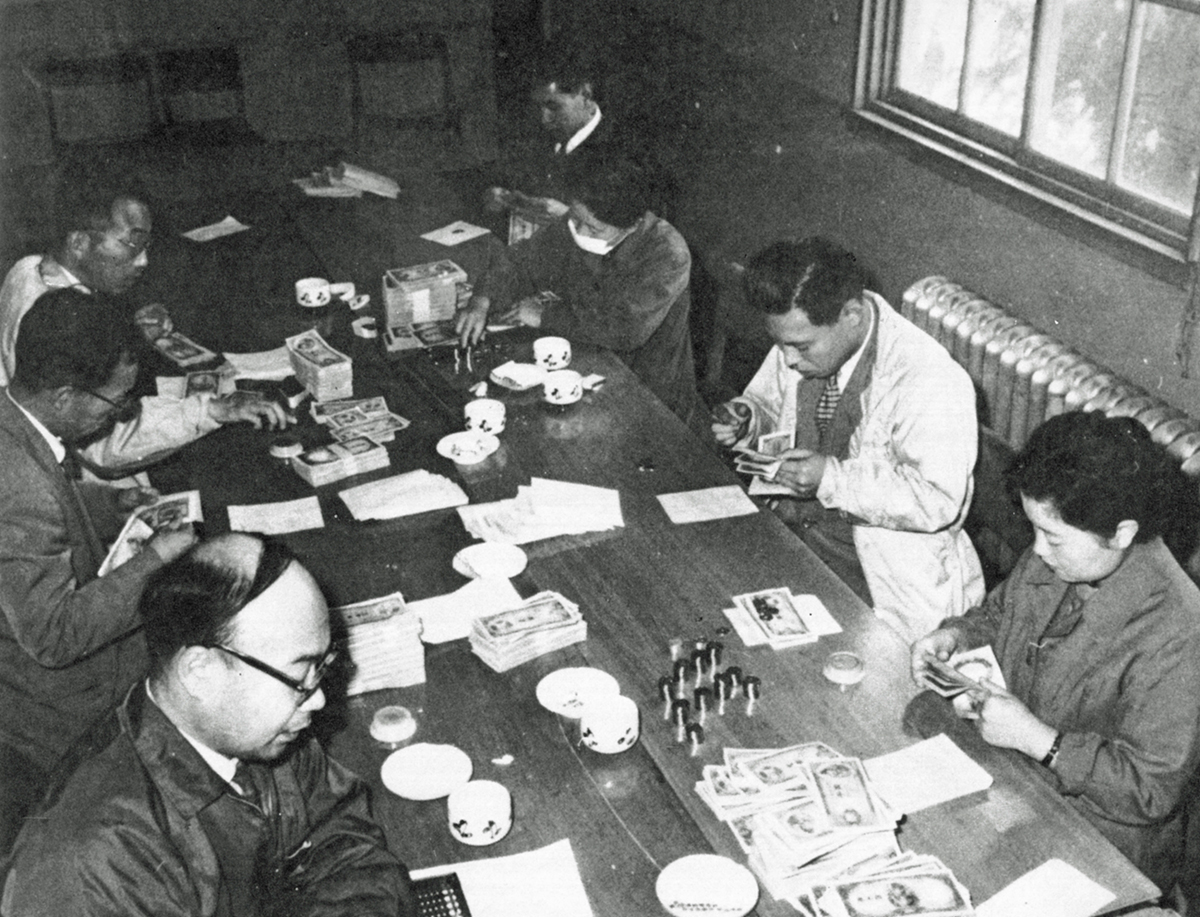 当時の給料は現金での支給が一般的だった。職員たちは算盤を使って現金を数えている。机の上の湯呑みや灰皿も当時の職場の雰囲気を伝える。