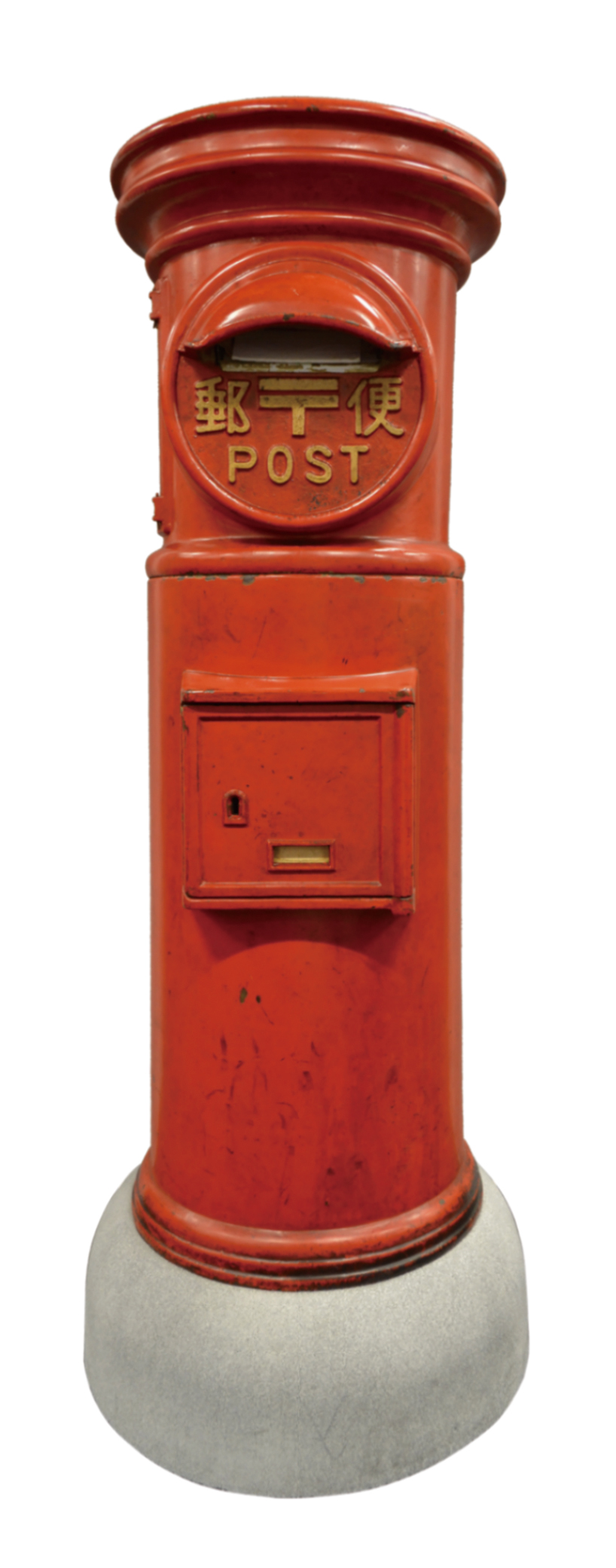 昭和24年(1949)に誕生した郵便差出箱1号丸型、いわゆる赤い丸型ポスト。差入口のある上部と取出口のある下部が別個に作られているので、設置場所の状況に応じて便利な方向に向けて据え付けることができる。 -
