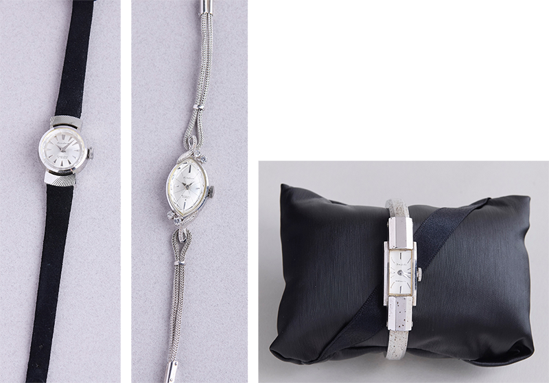 昭和30年代に入ると、腕時計は時間を表示する本来の機能のほかにアクセサリーとしての要素がより重視されるようになりました。女性が自分の意思で各分野へ進出し始めた時代でもあり、服部時計店はこの時代性を踏まえて「セイコーホワイト」を発売、キャンペーンを実施しました。「セイコーホワイト」シリーズは、お出かけ用の2個目、3個目の時計として人気を博し、女優やデザイナーなど第一線で活躍する女性にも愛用されました。時代の先端をいく女性向けファッション・ウオッチの幕開けとなった商品でした。