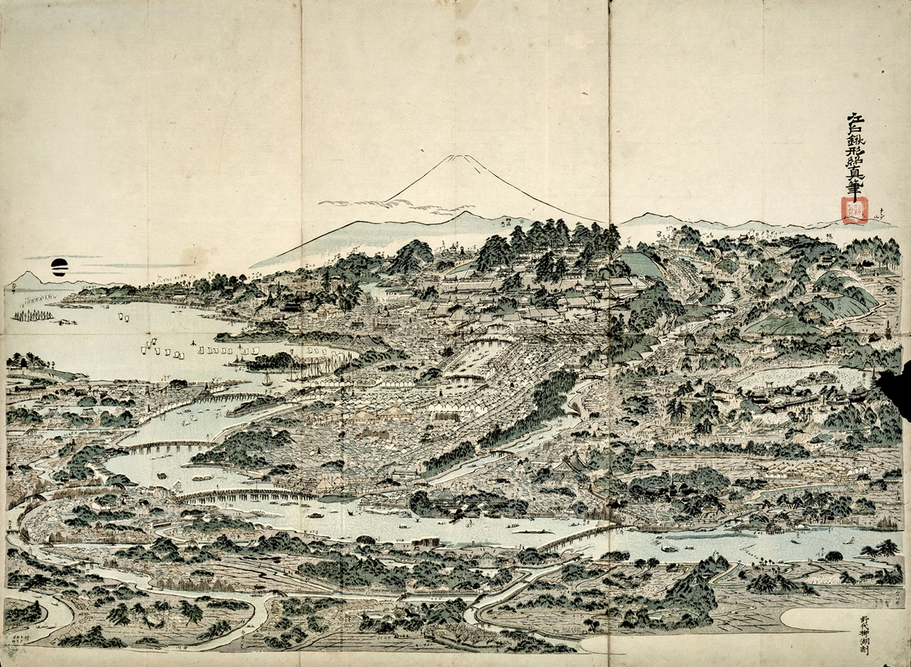 東から西を見る方向で、富士山を正面に、江戸市中が描かれている。画面下を流れるのが隅田川で、その下の田園地帯が向島。