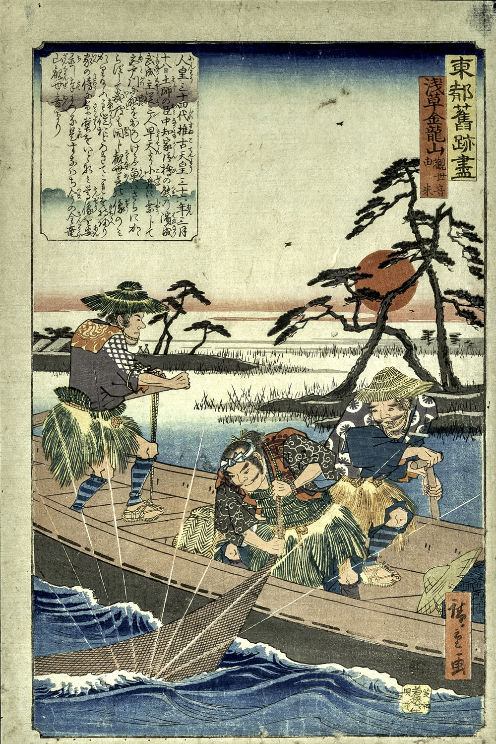 三人の漁師が隅田川から観音像を引き上げる場面が描かれている。 -