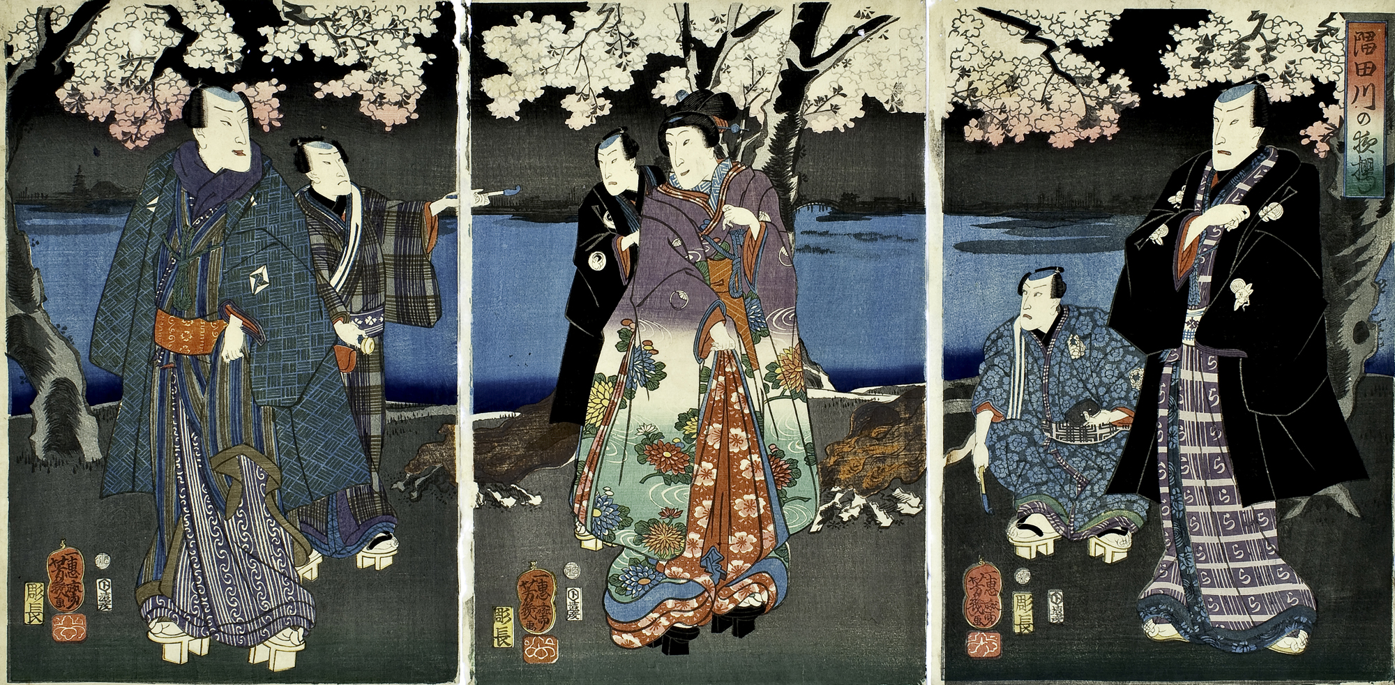対岸には待乳山と料理屋の有明楼があり、花見の人々がいるのは三囲稲荷前の堤。警官に叱られている人がいる。花見の場で怒る警官を描く作品は他にもあり、明治の東京の人々にとって、怒る警官の姿は印象的な光景だったのかもしれない。