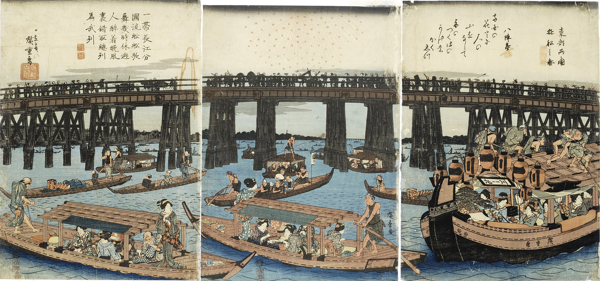 歌川広重は、多くの両国花火図を描いた。この図では、手前に見世物小屋や茶屋が明るく大きく描かれ、橋や船の人々が小さく描かれている。橋の上の人々が花火を見上げる様子が感じられる。