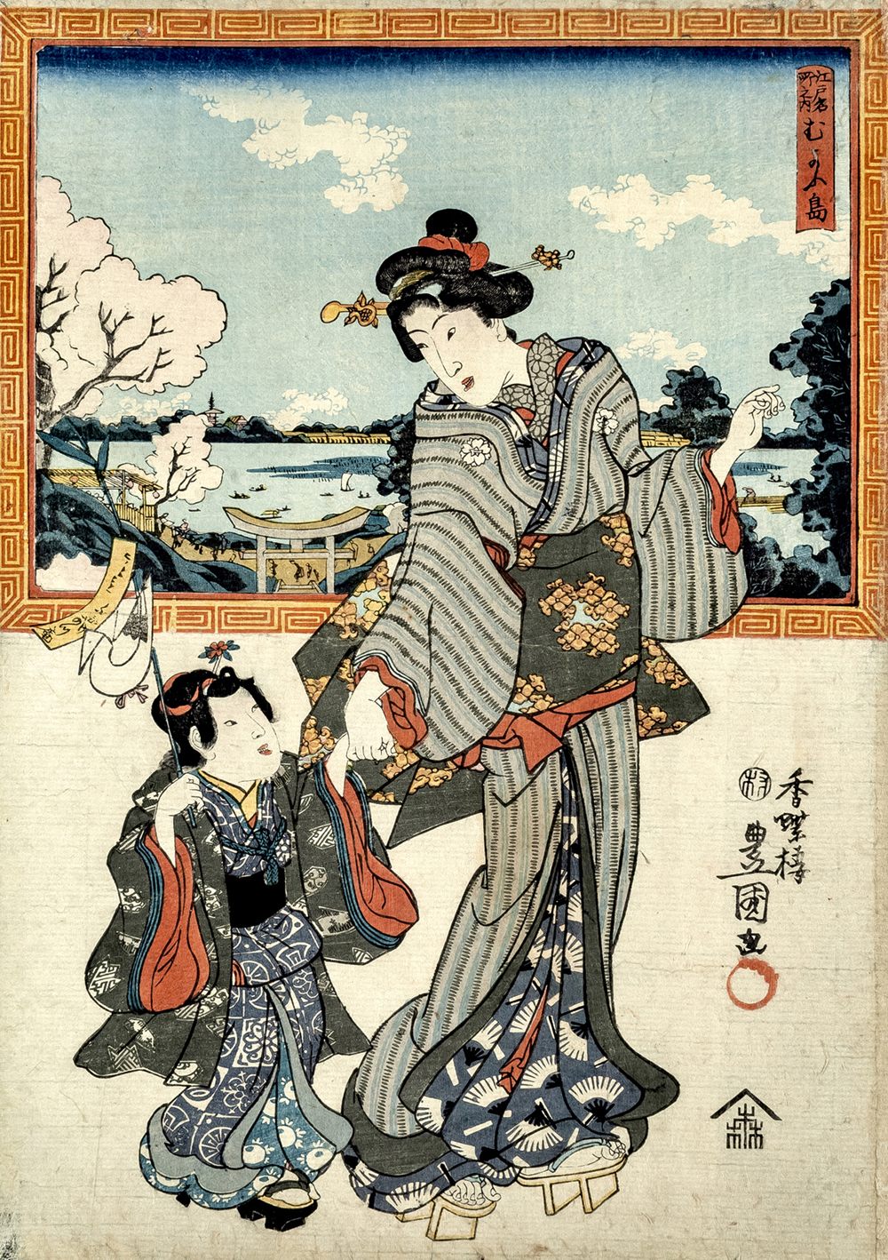 上部の長方形の雷文枠に大きく風景画を描き、手前にその地域に関連のある風俗の女性を描いたシリーズ。この作品では、隅田川を挟み、三囲の鳥居が手前に、浅草寺が対岸に描かれている。