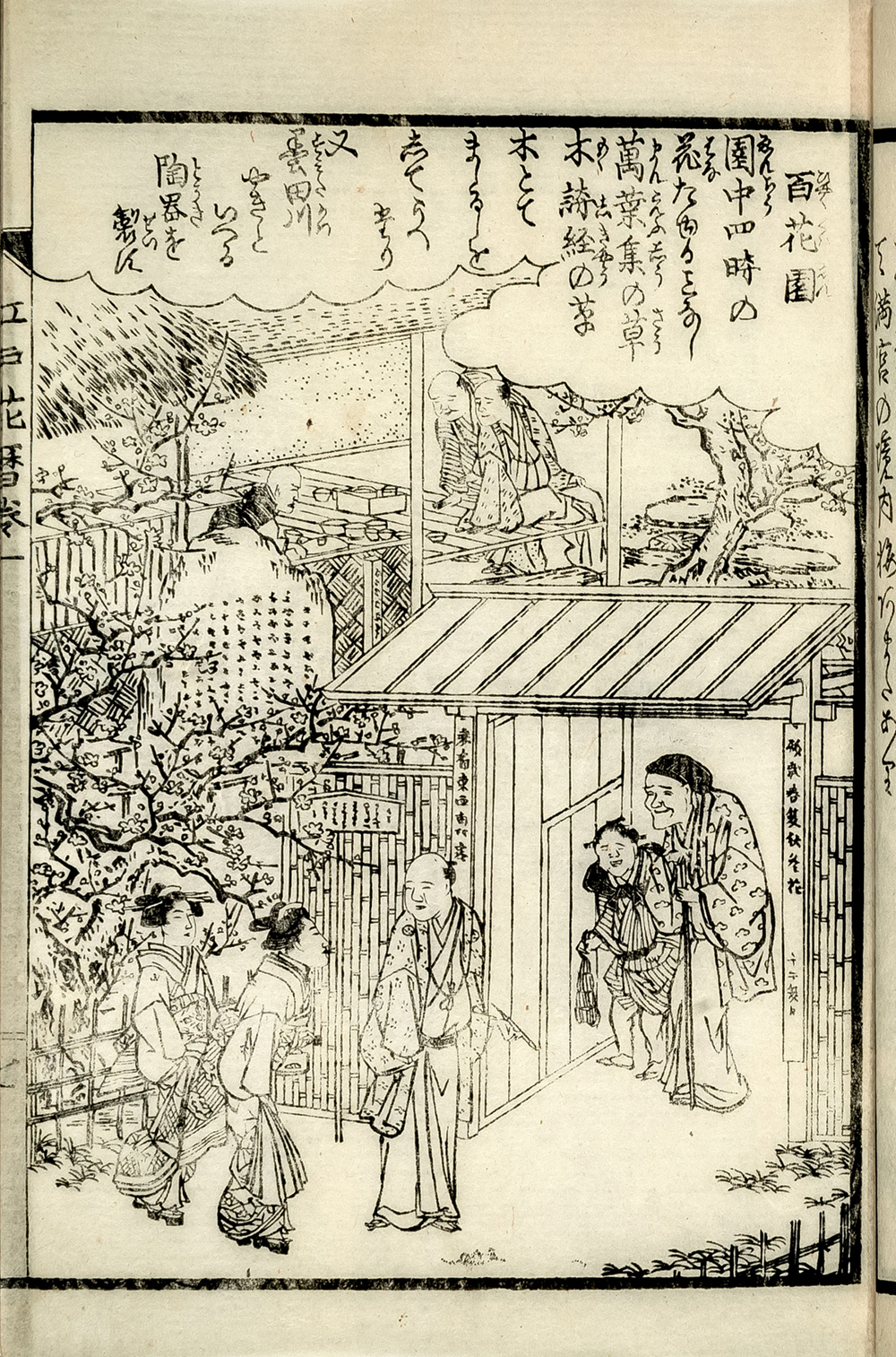 寺島村の百花園は、文化(1804〜1818)初め、佐原鞠塢(きくう)によって開かれました。360本の梅を植えたのが始まりで、亀戸の梅屋敷にちなみ、新梅屋敷と呼ばれました。まもなく秋の七草の名所としても知られるようになり、さらに四季の花を楽しむことのできる場として、花屋敷、あるいは百花園とも呼ばれるようになりました。将軍や文人も訪れる場として親しまれ、多くの浮世絵に描かれました。