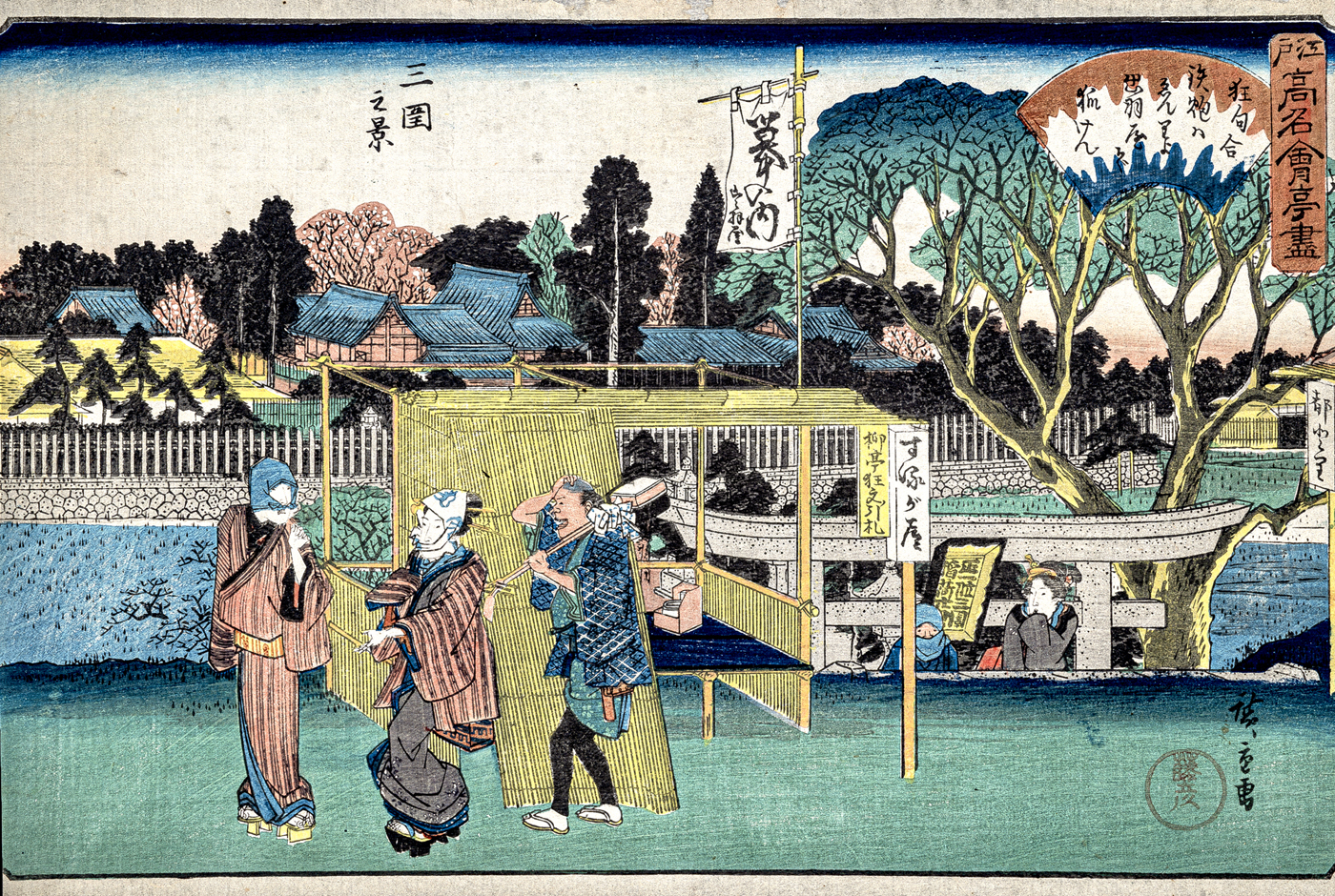 墨堤といえば桜が名高く、多くの浮世絵に取り上げられています。三囲(みめぐり)稲荷から木母寺まで続くこの桜並木は、八代将軍吉宗の命により、享保年間(1716〜1736)に誕生しました。墨堤は、江戸の中心から比較的近く、それでいて郊外の雰囲気を味わえることが喜ばれました。