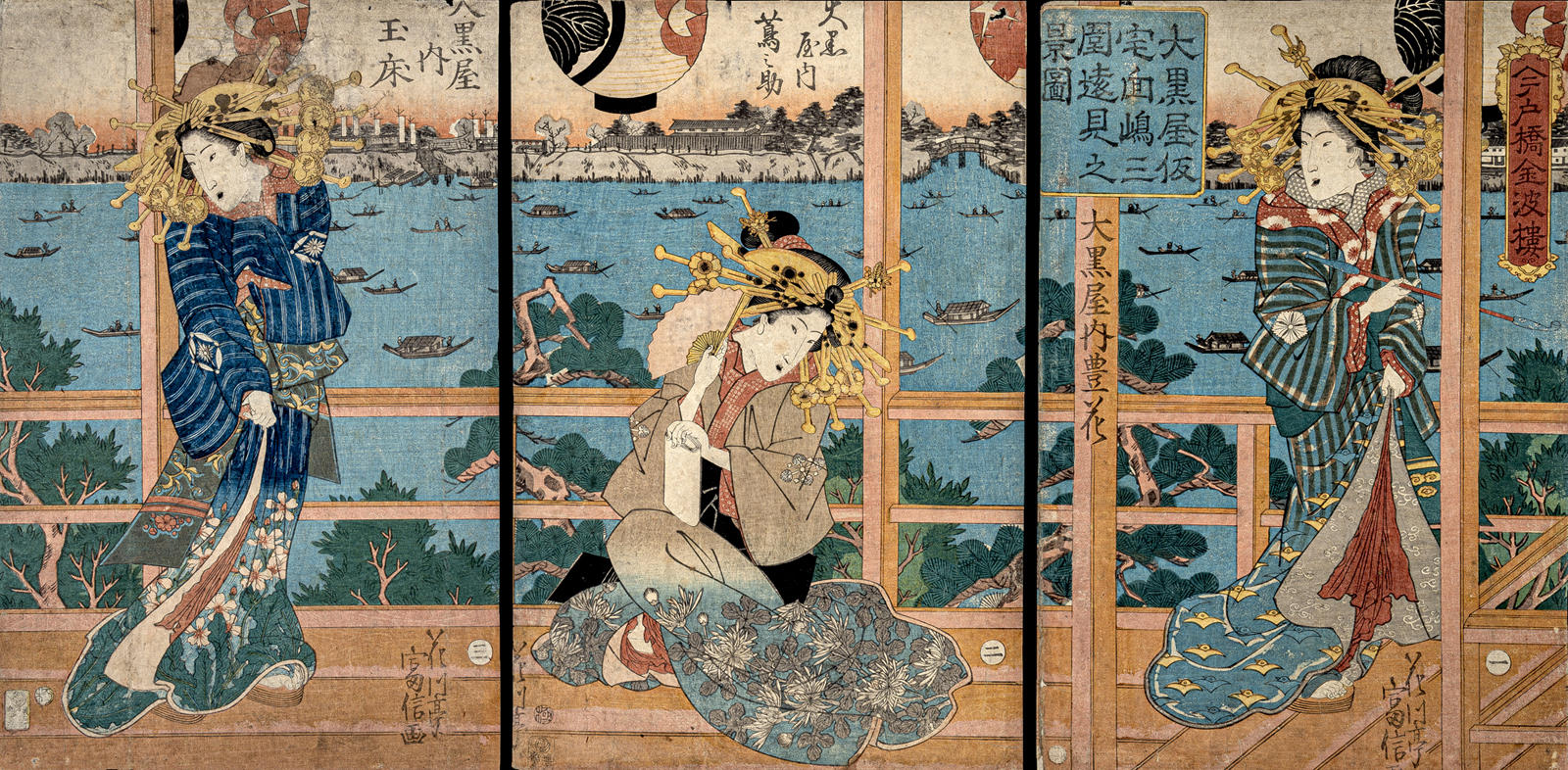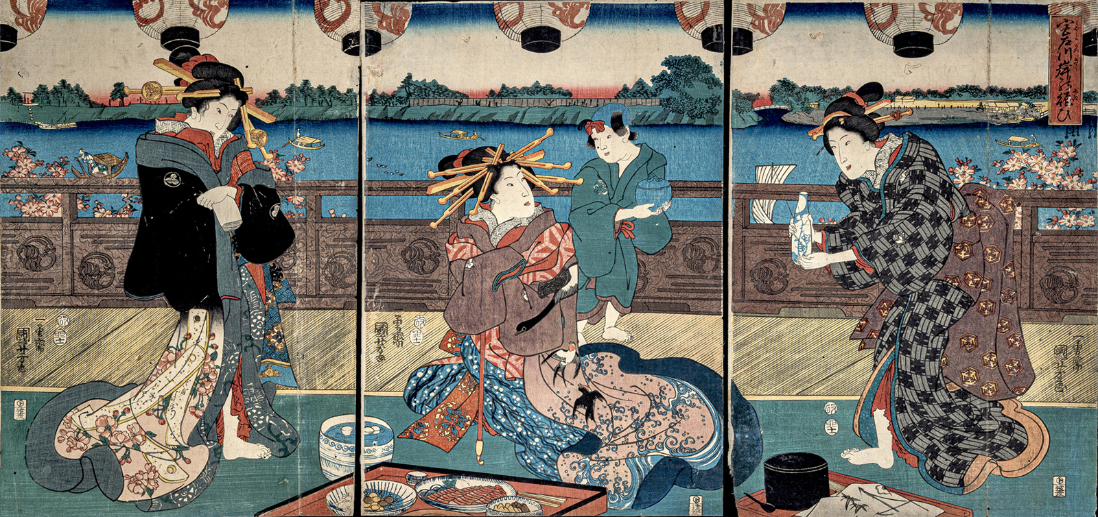 江戸には、数多くの料理屋があり、人々は食事を楽しむだけでなく、文化活動や交流の場としても利用していました。19世紀になると浮世絵にたびたび取り上げられるようになり、料理屋を主題としたシリーズや、美人画や役者絵にコマ絵で料理屋を添えたもの、料理屋を集めた双六など、さまざまな形のものが見られるようになりました。隅田川周辺の料理屋も多くの浮世絵に描かれていますが、特に隅田川沿いに位置していた料理屋は、吉原遊廓が火災などで焼失すると仮宅営業の場としても利用され、その様子も描かれています。
