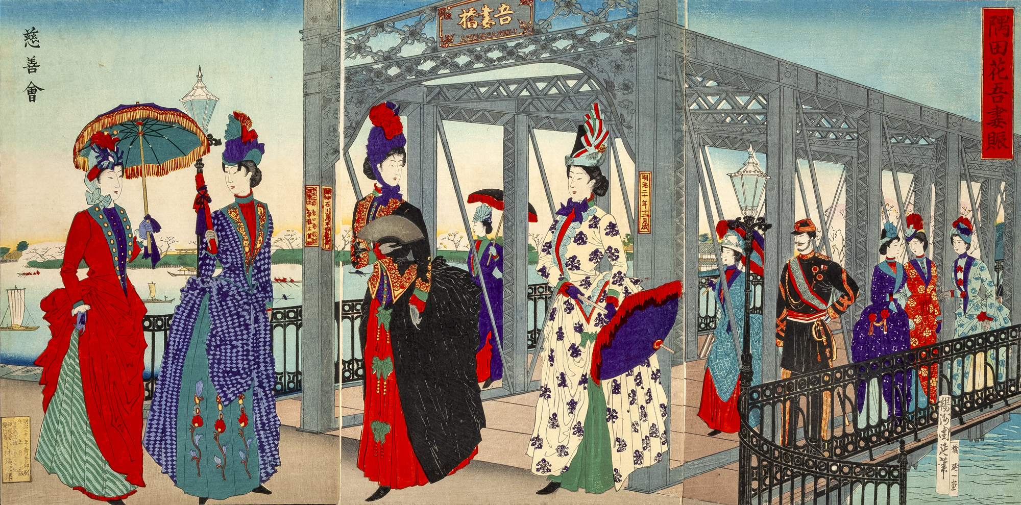 新しく架けられた吾妻橋、ガス燈、洋装の貴婦人たちが描かれている。