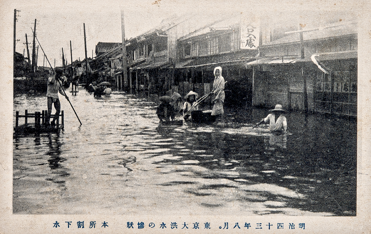 明治43年(1910)は、6月末から7月にかけて降雨が続き、8月には連日の豪雨で利根川や荒川の各所で堤防が決壊する大水害となった。この時の水害の様子をプリントした絵葉書も発行されている。