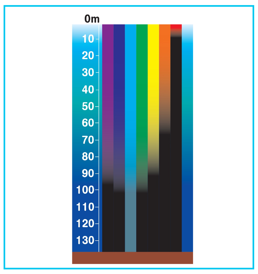 ⾚い光はすぐに海⽔に吸収されて⾒えなくなりますが、⻘い光は深くまでとどきます。 -