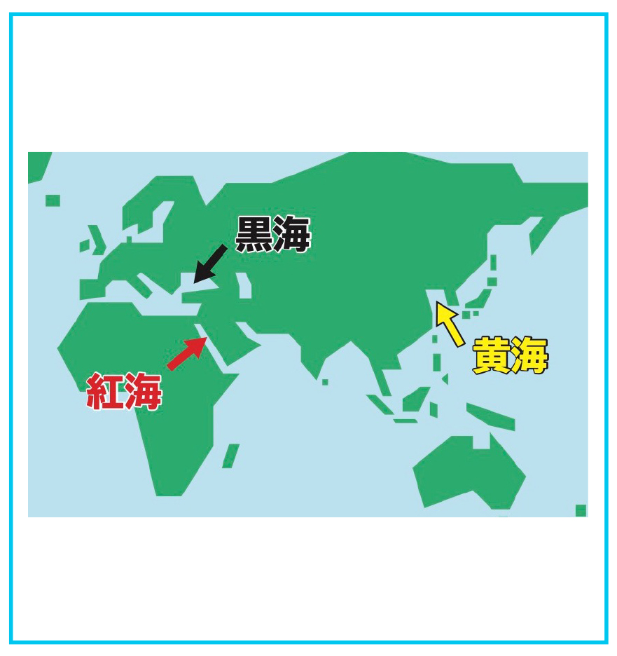 名前の理由にはいろんな説がありますが、「紅海」はまわりの砂漠が⾚いから、「⻩海」は⻩河が運ぶ⼟で⻩⾊く濁るから、「⿊海」は古代ペルシャ⼈が「暗い海」とよんだからのようです。 -