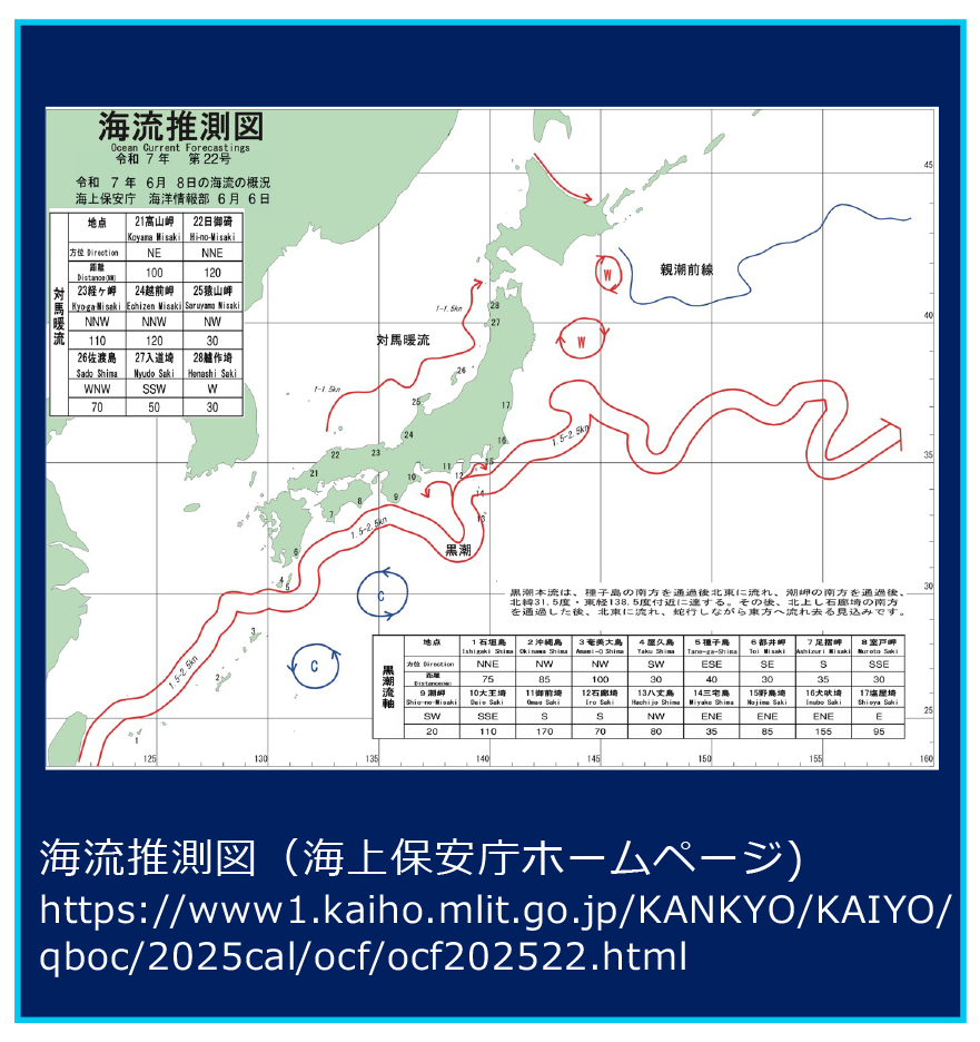 南から⽇本に流れてくるあたたかい海流があり、「⿊潮」とよばれます(図では太い⾚⽮印)。栄養やプランクトンが少ない熱帯の海⽔なのでとても澄んでいます。⻘い光も吸収される深さまで澄んでいて、ほとんど光が反射してこないため、⿊っぽく⾒えるのです。カツオなどの⿂も⼀緒に移動してきます。