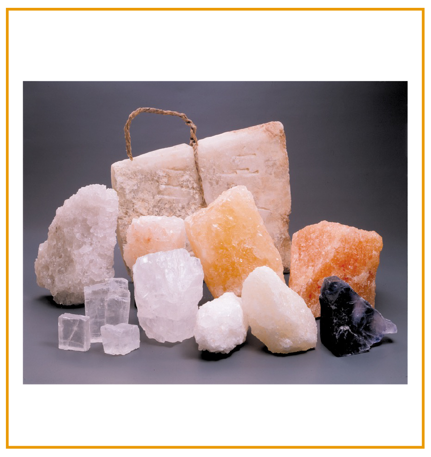 岩塩は⼤昔に、海⽔が陸に閉じこめられて結晶(けっしょう)したものですが、塩以外のものがまざって結晶に閉じこめられたり、結晶にゆがみができたりして、⾊がつくのです。 -