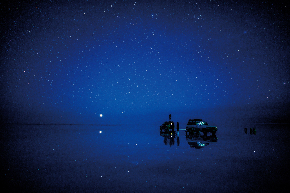 “昼間にスコップで集めた塩を積み上げた小山が並ぶ。その遥か先、塩の地平線に、オリオン座が逆さまになって沈んでいく。南半球では星座は逆さまに見える。当たり前のことだがすごく不思議な眺めだ。飽和した塩水は比重が重く、多少の風では水面が揺れないので、湖面が鏡のようになって、星がよく映る。”