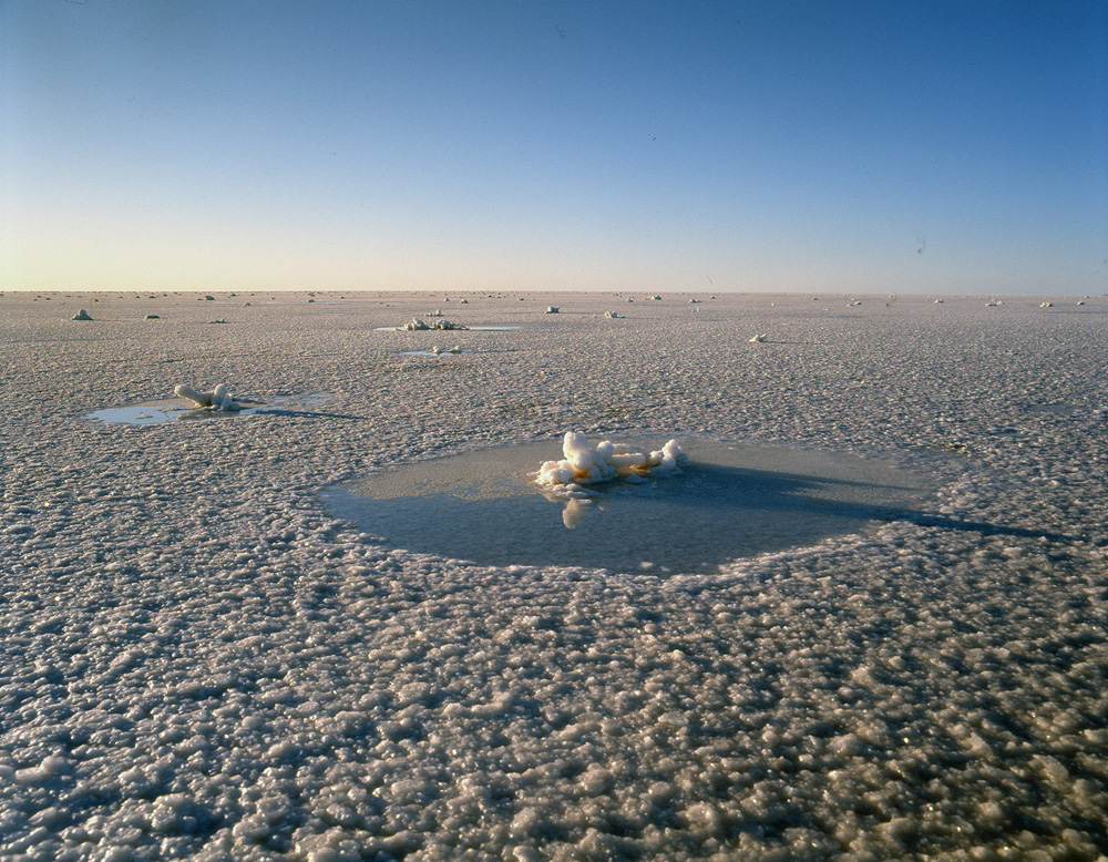 エーア塩湖の湖面を覆う塩の結晶