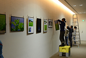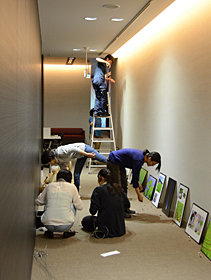 脚立や踏み台に乗って、作品をかけていっています。この後のレベル調整にも、なかなか時間がかかります。実習生の手付き、けっこう手慣れていますね。